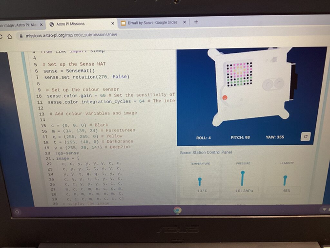 Supported by three Year 12 students during a 90-minute workshop to help twenty Year 3 students write a Python program. The program will take a reading from the colour and luminosity sensor of an Astro Pi computer on board the International Space Station, and use it to set the background colour in a personalised image for the astronauts to see as they go about their daily tasks.